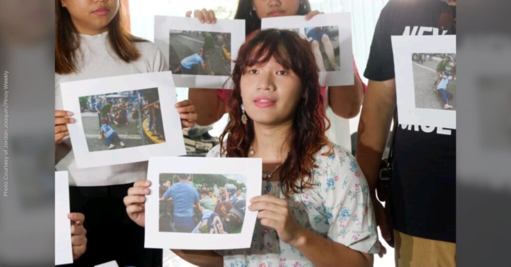 “Doon na po ako dinrag ng isang police officer na naka-civilian sa pamamagitan ng pagsasakal sa aking leeg with both of his arms. Tapos kinaladkad niya ako sa pavement. And sure tayo na sila ay most likely na police officer dahil sila ay nakahanay kasama ng mga police officer and doon niya din ako ambang dalhin (A police officer in civilian clothes dragged me across the pavement by strangling my neck with both of his arms. We are sure that he is most likely a police officer because he was lined up with the police and he also intended to take me to them),” she recounted in an online interview with FEU Advocate.