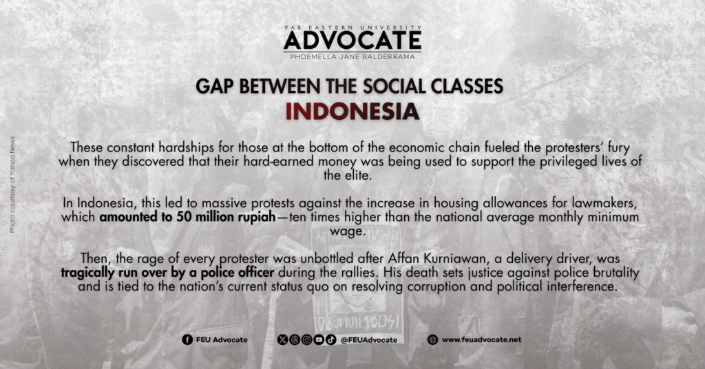 Then, the rage of every protester was enlivened when Affan Kurniawan, a rideshare driver, met his death after being tragically run over by a police officer during the rallies. His death sparked long-standing calls for justice and a fight against police brutality, tied within the nation’s current status quo, prevalent with corruption and political interference.