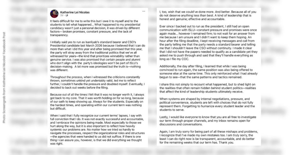 A day after the partylist’s statement, ISLU’s supposed FEUCSO presidential candidate and incumbent treasurer posted a separate statement on her Facebook account to clarify what happened in her late COC submission.